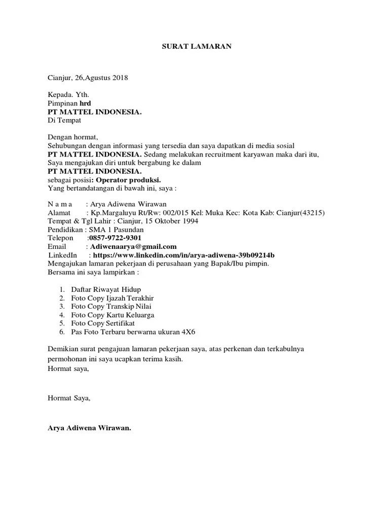 Ingin mengajukan diri melamar pekerjaan sebagai operator produksi di pt. Biasanya menjadi karyawan pabrik adalah lowongan paling umum dipilih para lulusan, utamanya yang belum punya keterampilan khusus. Itu via pos bisa through po box bisa via alamat kantor atau thru email. Contoh surat lamaran kerja via email; Lamaran pekerjaan di perusahaan yang bapak / ibu pimpin sebagai operator produksi. Cara mengirim kerja via email. Contoh surat lamaran kerja, format & cara membuat, menarik hrd. Contoh surat lamaran kerja operator produksi. Dikirim apakah itu via pos bisa through po box bisa via alamat kantor atau thru email. Contoh surat lamaran kerja via email. Kamu via nomor telepon / email yang kamu cantumkan disurat lamaran kerja . Contoh surat lamaran kerja di perusahaan via email. Contoh surat lamaran kerja bagian produksi sebagai operator.